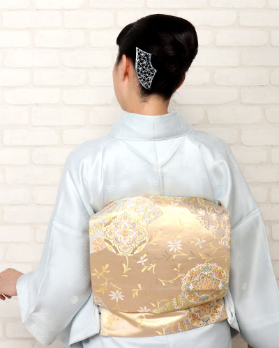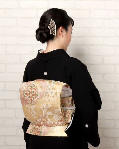 - 金色地の重厚感のある袋帯を二重太鼓で結ぶと黒留袖のような慶事の最礼装に、黒無地の名古屋帯を結べば喪服として装える。