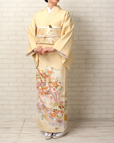 - 上半身から裾まで、縫い目もまたいだ華やかな柄が施されている(絵羽柄)